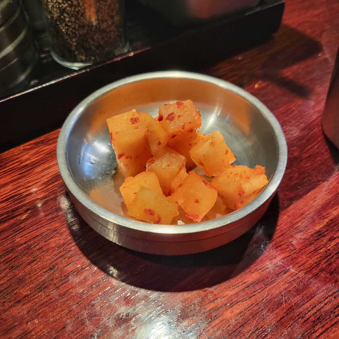 각 좌석마다 셀프로 퍼먹을 수 있는 깍두기가 배치되어 있다.